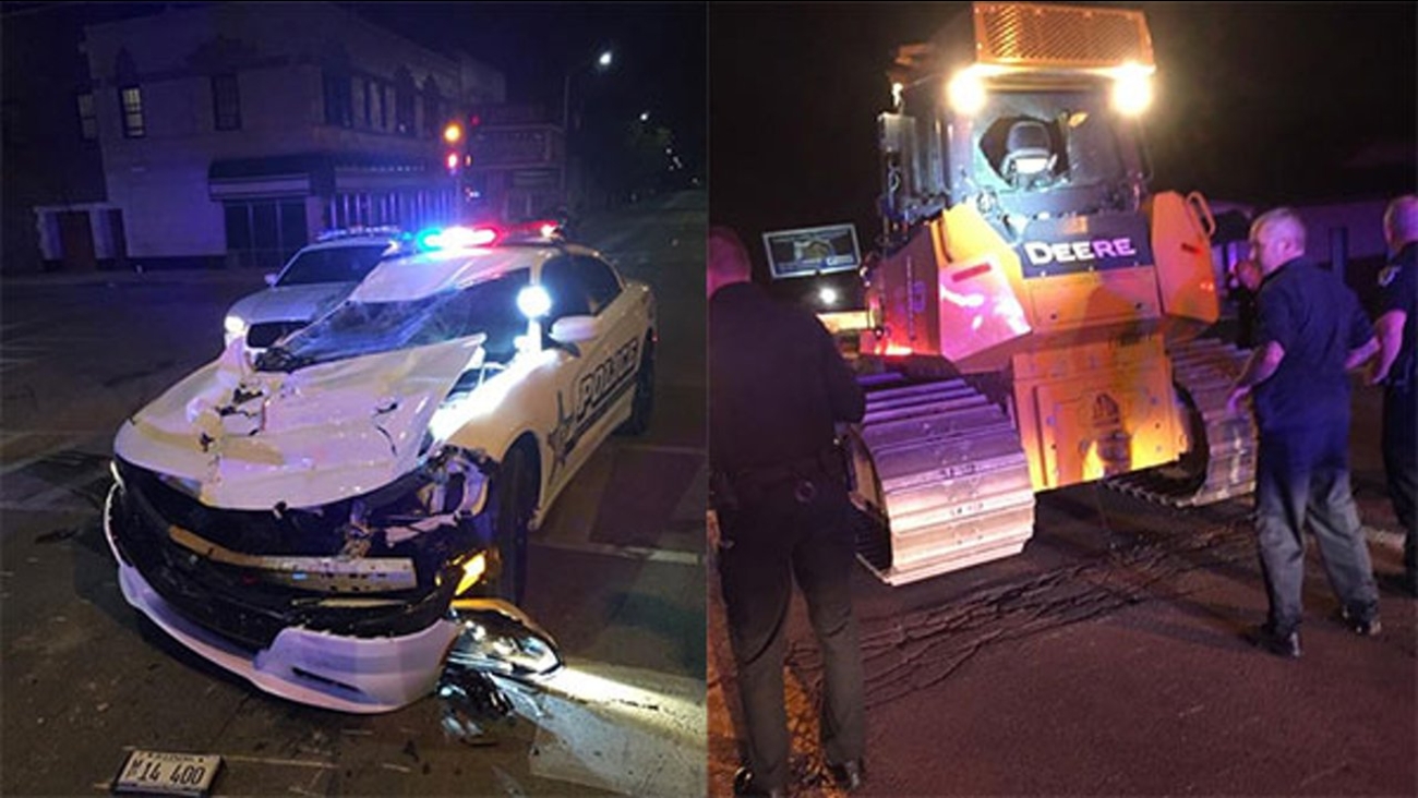 KANKAKEE, Ill. (WLS) -- A Bourbonnais man stole a bulldozer in far south suburban Kankakee and drove it around the streets, backing over a squad car when officers tried to stop him, police said.