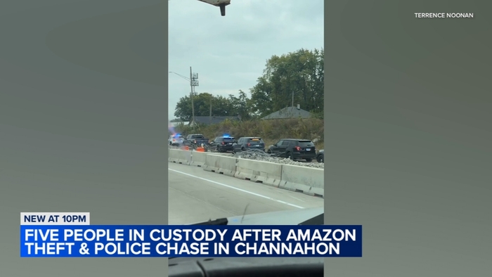 Five people were taken into custody after a police chase on I-80 involving a U-Haul packed with stolen Amazon boxes, police said.