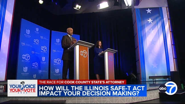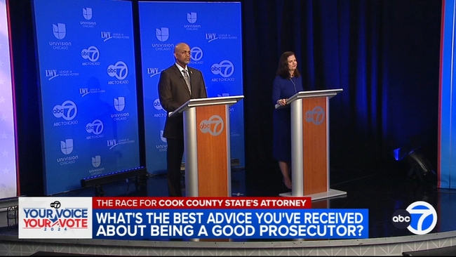 CHICAGO (WLS) -- ABC 7 Chicago anchors Judy Hsu and Ravi Baichwal will lead a commercial-free, 60-minutes debate "Your Voice Your Vote 2024: The Cook County State's Attorney Democratic Primary Debate." The two candidates vying for the Democratic nomination in the primary race for Cook County State's Attorney will talk about the important issues and concerns affecting the people of Cook County, including public safety and crime. ABC 7 is partnering with WGBO/Univision Chicago, the League of Women Voters of Cook County, and the League of Women Voters of Chicago to present this debate. ABC 7 Political Reporter Craig Wall and Univision Chicago Reporter Mariano Gielis will be part of the panel questioning the candidates. ABC 7 has invited several Chicago and Cook County community organizations to the debate where they are encouraged to also ask questions of the candidates.