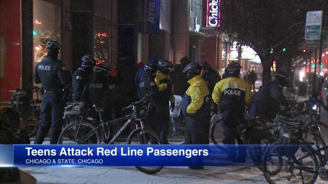 About 7:30 p.m. Saturday, the teenagers attacked two men, 28 and 26 years old, and a 29-year-old woman at the Chicago and State station at 800 North State Street, according to Chicago police. All three suffered bruising and lacerations on their faces and bodies and were treated on the scene by Chicago Fire Department paramedics.