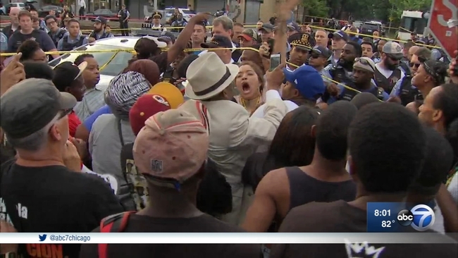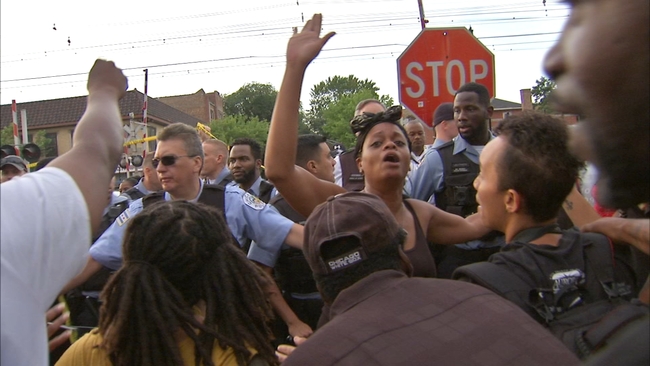 The incident occurred near 71st Street and Clyde on the South Side, where crowds gathered afterwards and, at times, scuffled with police. The crowd chanted, "No justice, no peace." After hours of tension, the group became "combative" and arrests were made after protesters jumped on top of two squad cars and causing damage.