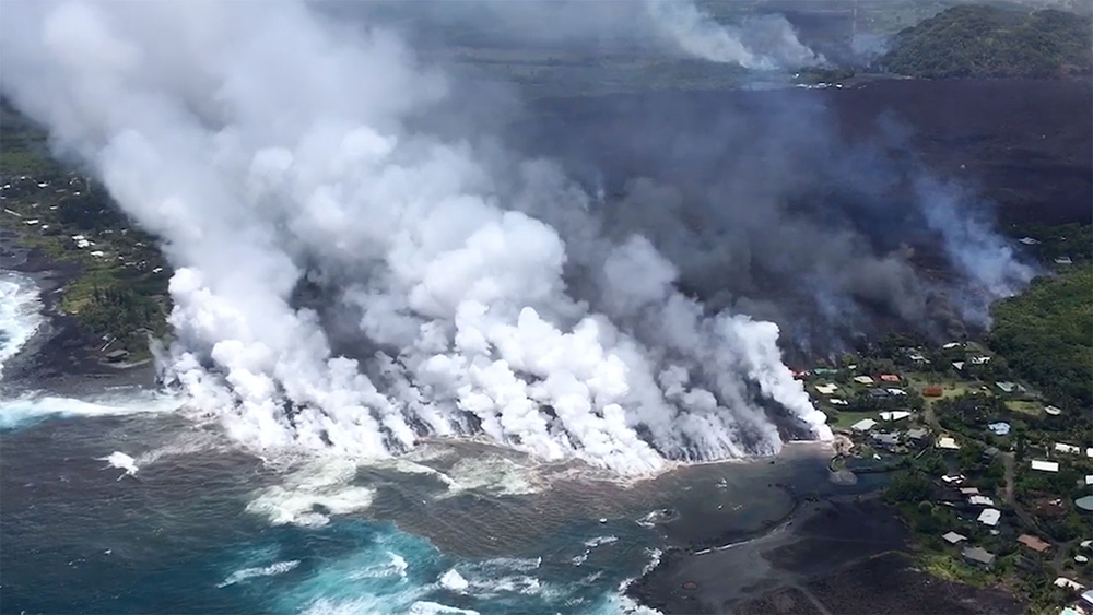 New aerial video from the U.S. Air National Guard shows how the two major events altered the island's landscape. The Aug. 28 footage shows still-smoldering volcanic fissures surrounded by miles of charred landscape, coastal areas ravaged by landslides and homes cut off from the rest of the island by cooling lava flows.