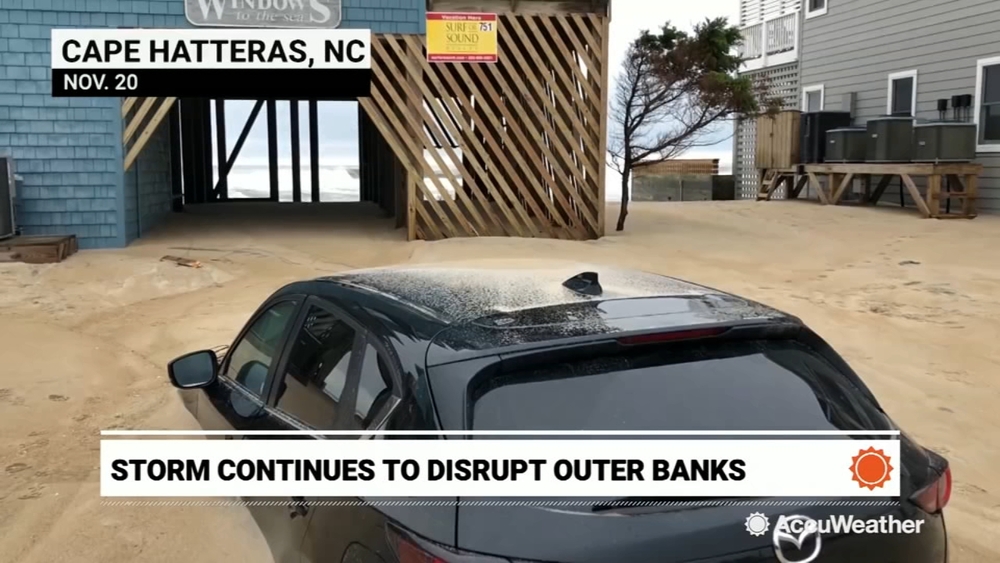 In North Carolina's Outer Banks, an area that's seen significant storm damage this season, ocean overwash spread across Highway 12 at a motel near Buxton, the Dare County Sheriff's Office posted online Sunday. The office urged travelers to be cautious and put property owners on alert as high tide approached.