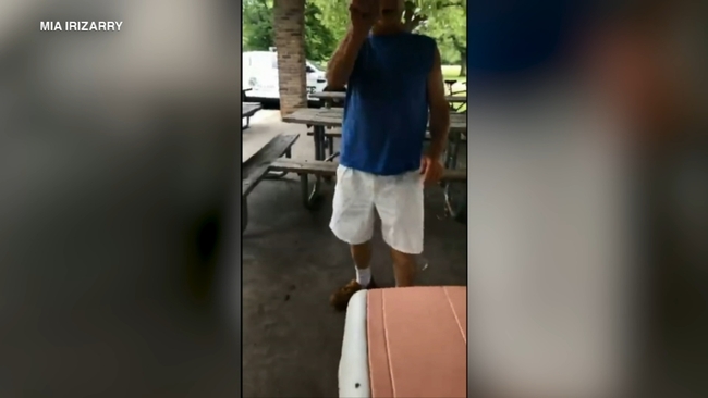 Irizarry asks a park police officer to help, saying "I am renting this area and he's harassing me about the shirt that I'm wearing."