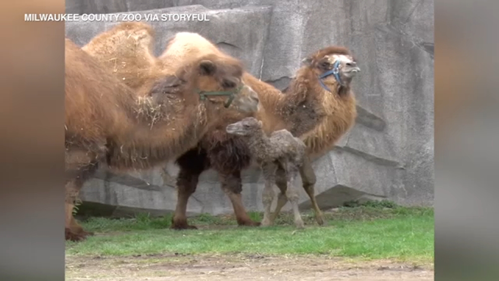 Newborn camel explores habitat with parents at Milwaukee Zoo